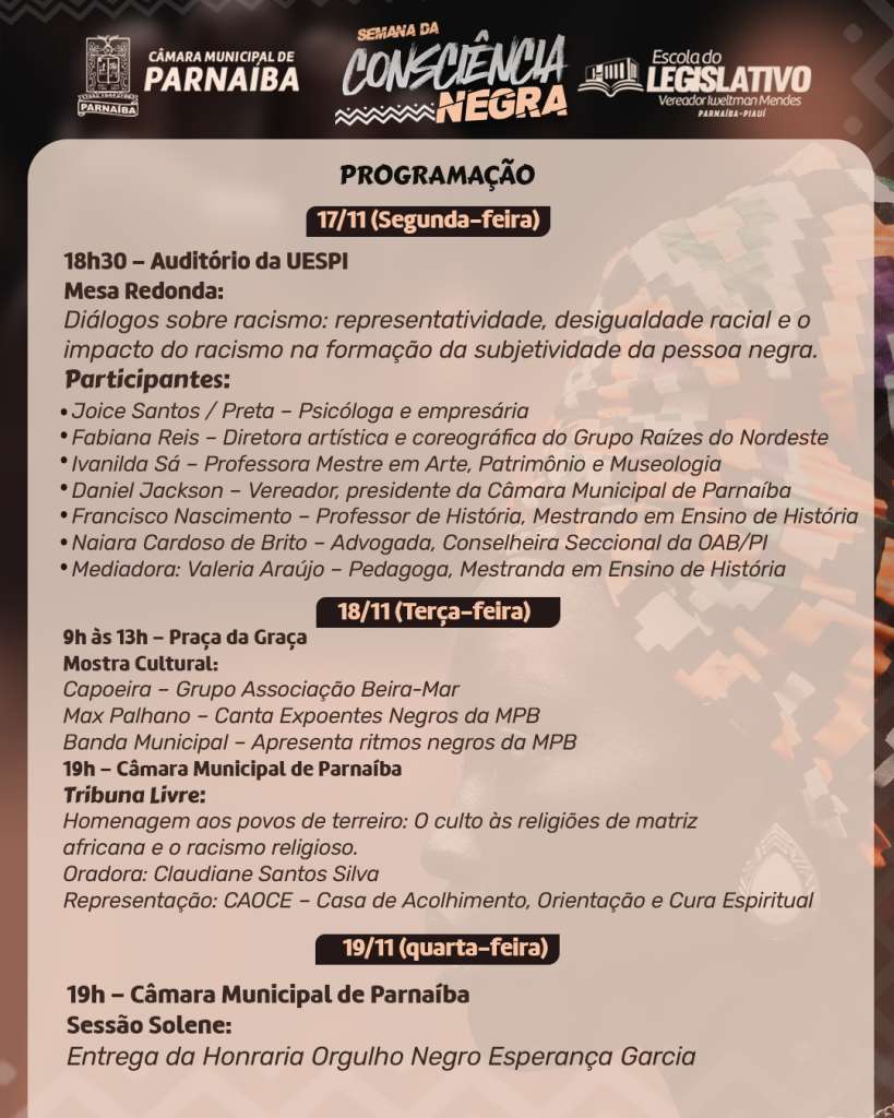 A Câmara Municipal de Parnaíba, juntamente com a Escola do Legislativo Parnaibano “Vereador Iweltman Mendes”, realiza a Semana da Consciência Negra, com uma programação diversificada, reunindo debates, apresentações culturais e homenagens que celebram a cultura afro-brasileira e reforçam a importância da luta contra o racismo.