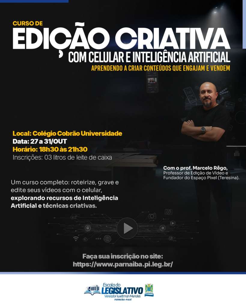 A Escola do Legislativo Parnaibano “Vereador Iweltman Mendes”, instituição da Câmara Municipal de Parnaíba, está com inscrições abertas para o Curso de Edição Criativa com Celular e Inteligência Artificial, que será realizado de 27 a 31 de outubro, no Colégio Cobrão Universidade, das 18h30 às 21h30.